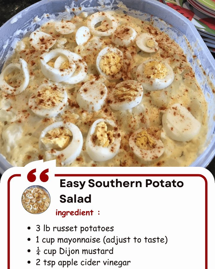 here’s a very detailed, step-by-step Easy Southern Potato Salad, the kind that shows up at cookouts, church suppers, and beside BBQ plates. Creamy, tangy, and old-school in the best way. 🥔✨
