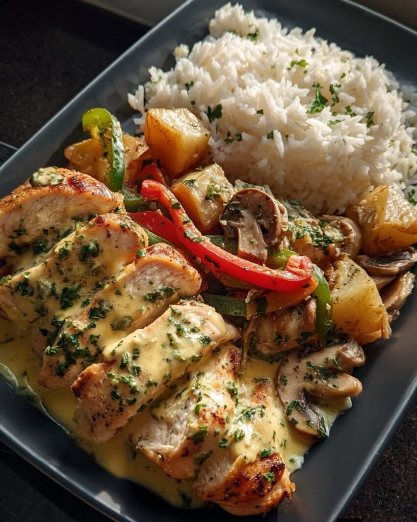Here’s a Juicy Herb Chicken with Garlic Cream Sauce, plus a colorful veggie medley and fluffy rice to soak it all up.