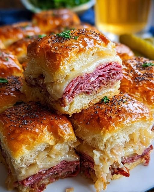 Reuben Sliders are mini sandwiches loaded with corned beef, sauerkraut, Swiss cheese, and tangy Russian dressing. Perfect for parties, game days, or a fun family meal.