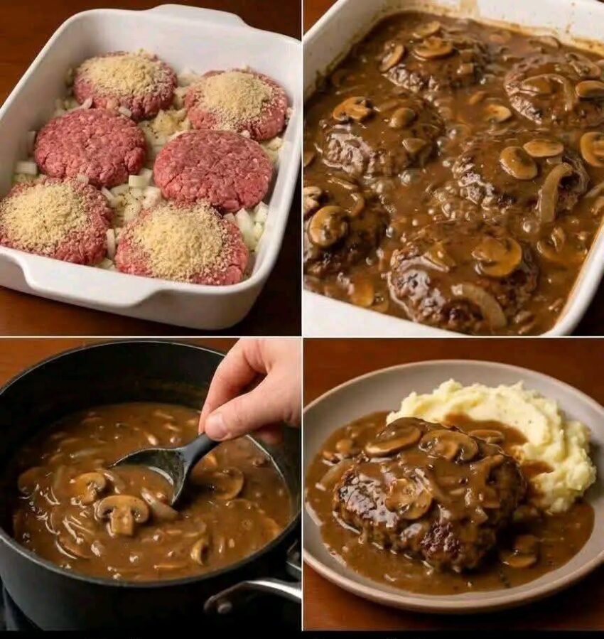 Here’s a classic Salisbury steak with mushroom gravy—simple, comforting, and old-school good.